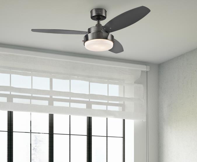 Add a contemporary touch to any room with the Alloy indoor ceiling fan, designed with a low-profile silhouette. The 42 inch ceiling fan with light features reversible blades with black and graphite finishes to coordinate with the gun metal ceiling fan.