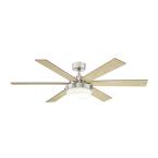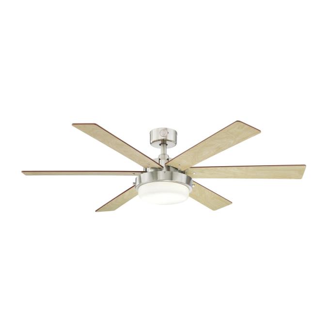 - Ceiling fan in brushed nickel finish with six coordinating blades of rosewood and light maple provides sleek, contemporary style