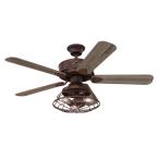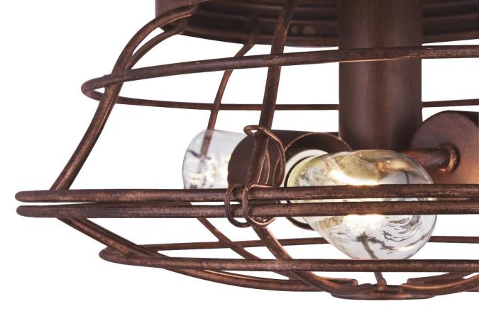 The Barnett 48-inch ceiling fan showcases an industrial aesthetic with rustic undertones, featuring a barnwood finish fan and wood-grain blade finishes of reclaimed hickory and pewter ash. A cage shade around three vintage-style LED bulbs completes the look.