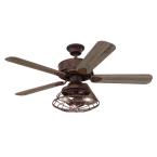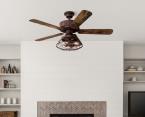 The Barnett Smart fan has eye-catching appeal with a barnwood finish, wood-grain look blades of reclaimed hickory and pewter ash finish, and a cage shade including three energy-efficient, vintage-style LED bulbs.