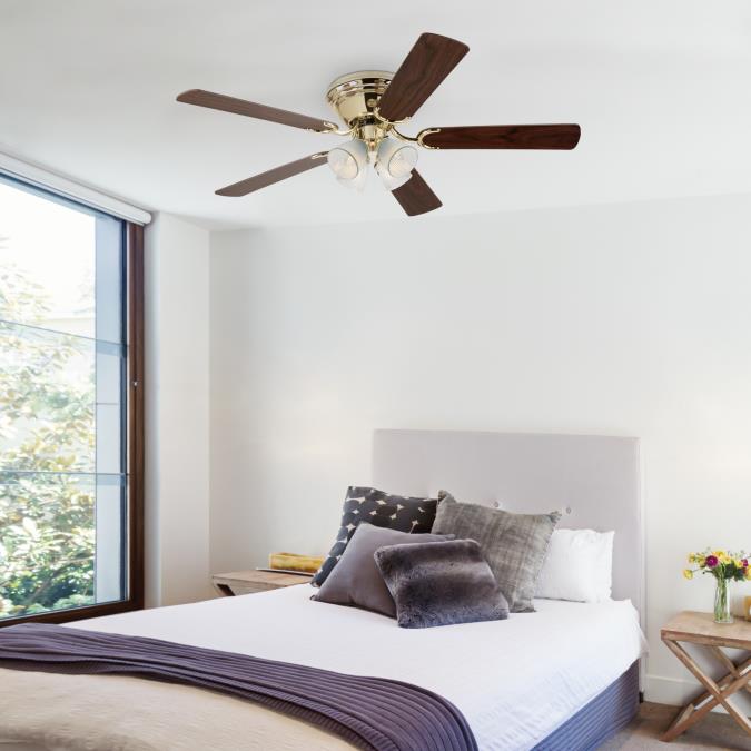 - Reversible walnut and oak blade finishes complement the polished brass ceiling fan finish, and offer attractive options to accentuate your decor