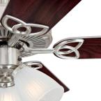 Enjoy classic elegance with the Vintage 52 inch ceiling fan with light, including three frosted ribbed glass shades and dimmable LED light bulbs. Delivering substantial air circulation and remarkable illumination to any larger-size room, this traditional ceiling fan features a brushed nickel finish and reversible wood finish blades of rosewood and light maple.