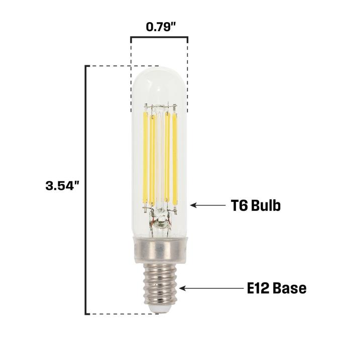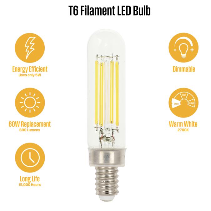 - This clear T6 filament LED reduces energy costs by up to 92 percent compared to a 60-watt incandescent bulb