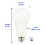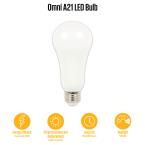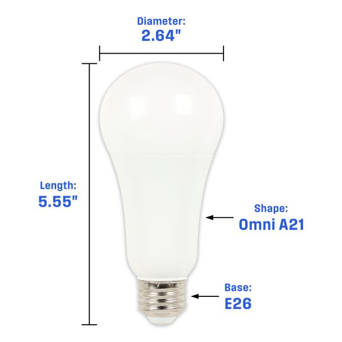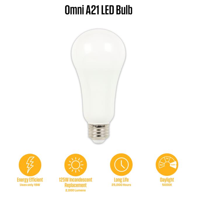 MULTIPURPOSE: Designed as a non-dimmable Omni A21 LED bulb, it provides 360-degree illumination, making it ideal for table lamps, floor lamps, and ceiling lights.ILLUMINATION: Delivers 2000 lumens of brightness with a bright white appearance at 5000K.ENERGY EFFICIENT: Replaces a 125-watt incandescent bulb but uses only 19 watts, ensuring energy savings and a longer lifespan.DAMP RATED: Suitable for enclosed fixtures, damp locations, and outdoor-rated lanterns.LONG LASTING: Instantly reaches full brightness and lasts an average of 25,000 hours, outlasting conventional bulbs by years.