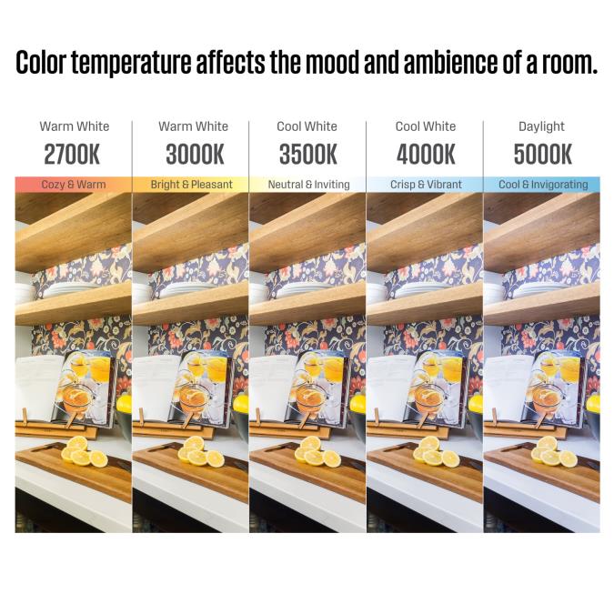 - Five color temperatures in one bulb: 2700K, 3000K, 3500K, 4000K, 5000K