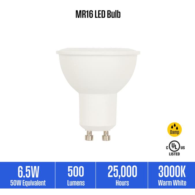 The MR16 LED mini reflector flood light bulb is an energy-efficient and long-lasting replacement for mini reflector halogen flood bulbs. This dimmable LED bulb emits a warm 3000K light, making it ideal for track and recessed light fixtures in retail or home lighting applications where task or accent lighting is necessary. It is suitable for damp locations such as outdoor-rated accent and landscape light fixtures.
