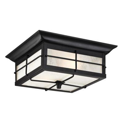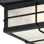 Provide welcoming light outside your home with the Orwell two-light flush-mount fixture. With bold lines and a textured black finish, the Orwell is an upgraded traditional outdoor fixture. Frosted seeded glass provides a soft decorative glow.