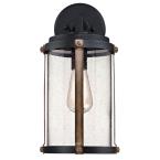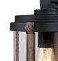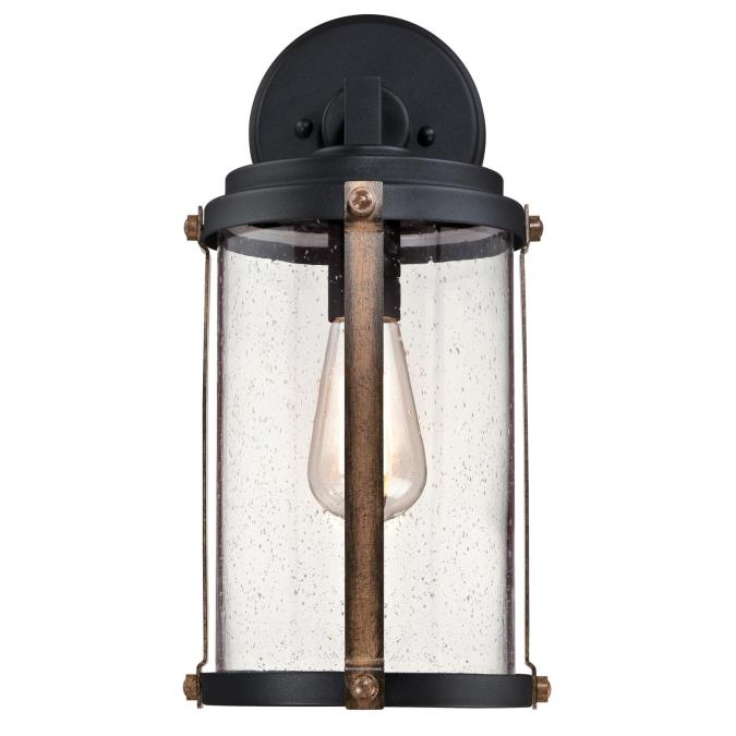 - This outdoor wall lantern features a two-tone finish of textured black and barnwood, giving it a touch of vintage flair