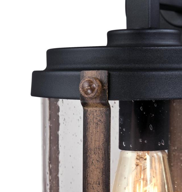 The Armin fixture family is the perfect accent piece for any outdoor space. Textured black and barnwood finishes accentuate the seeded glass cylinder. This charming design enhances traditional and vintage style exteriors with decorative style and brightness.