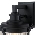 The Armin fixture is the perfect accent piece for any outdoor space. A textured black finish accentuates the elegant, ribbed glass cylinder. This design enhances traditional and vintage industrial style exteriors with decorative brightness.