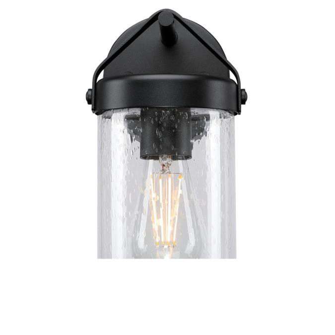 Shed brilliant light on your patio ensemble with the transitionally designed Jamestown outdoor wall lantern. This cylinder shaped lantern gets a modern update with softened edges and stylish metal strap detail. It features a textured black finish with clear seeded glass. We recommend pairing with our clear filament ST20 LED light bulb for energy-saving illumination, visual interest and to cast a warm, inviting glow.