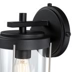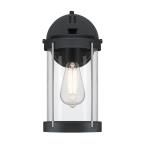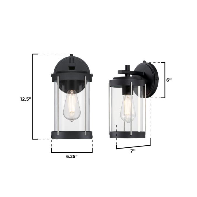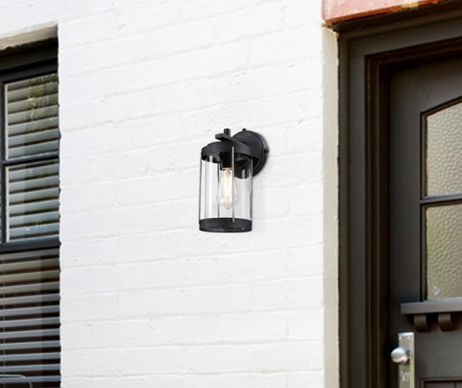 - Textured black finish with industrial steel accents and clear cylinder glass provide a crisp, clean look to complement any home's exterior