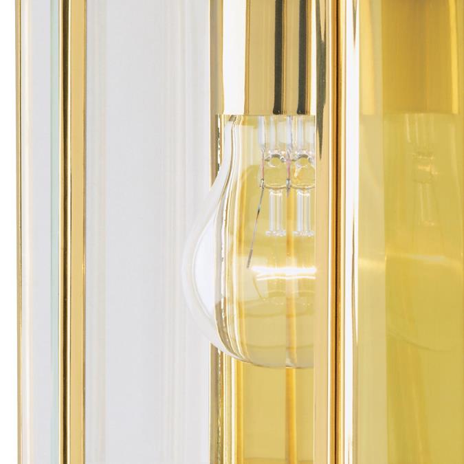 Fit for a manor, this exterior wall lantern adds polish to your home. Light plays off the mirror-like finish of the solid brass and steel frame. The clear beveled glass panels create a prismatic effect that lends further brightness.