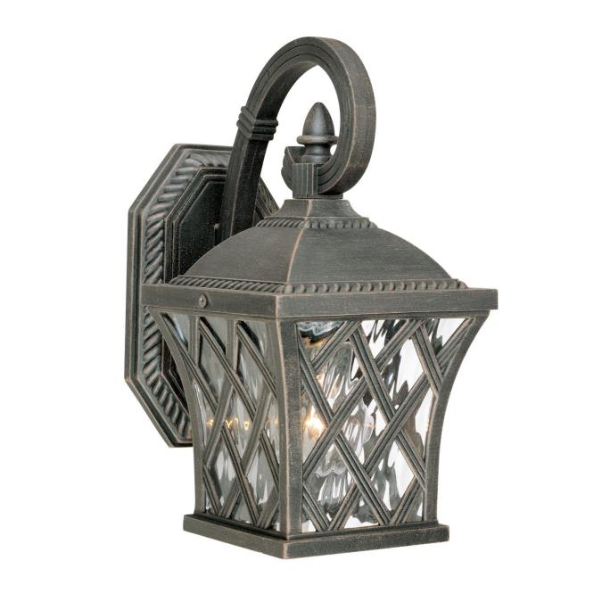 With its rustic yet dramatic design, this one-light exterior wall lantern exudes historic charm. The rust finish, reminiscent of wrought iron, and clear water glass, embellished with a striking lattice design, give the lantern an aged quality that adds to its character. This lantern also features a scroll arm, finial accent, and rope detailing on the cap that matches the border of the back plate.