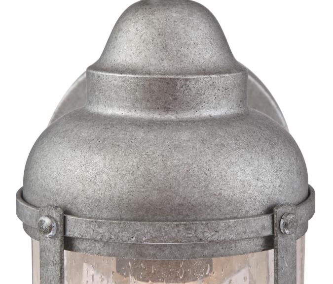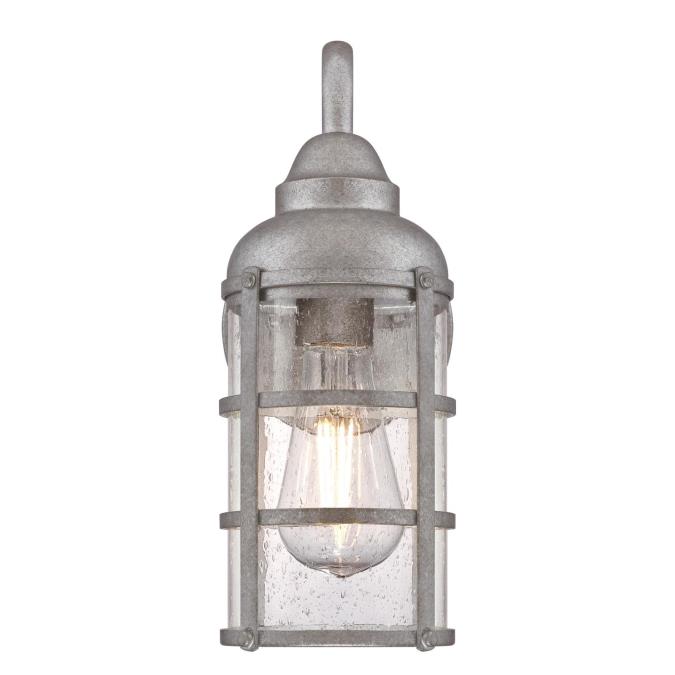 The Rezner outdoor wall lantern features an authentic industrial look, complete with metal cage and galvanized steel finish. Clear seeded glass pulls the look together and enhances the overall character.