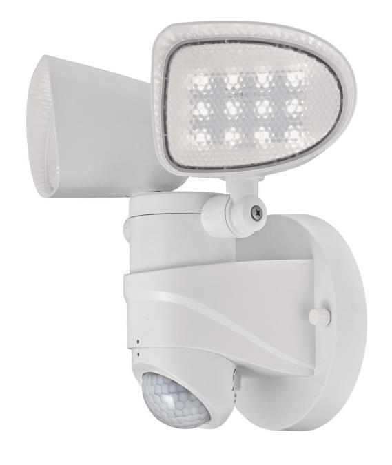 White security light with integrated LED and motion sensor, installation instructions and mounting hardware.