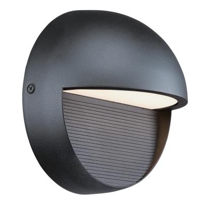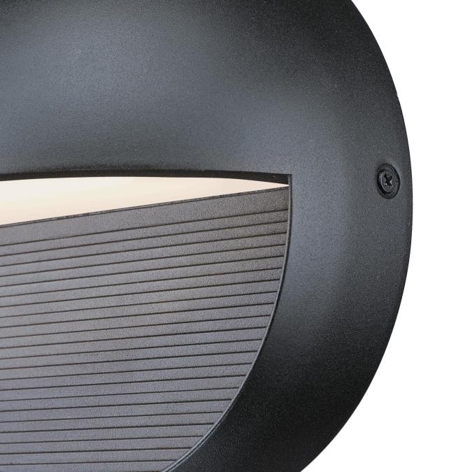 A smooth bisected dome finished in textured black with a frosted glass panel sheds downcast light over a ribbed backplate. It features weather-resistant construction and ensconced LED technology to withstand the elements outdoors, and provide long-lasting energy-efficient lighting.