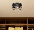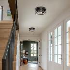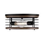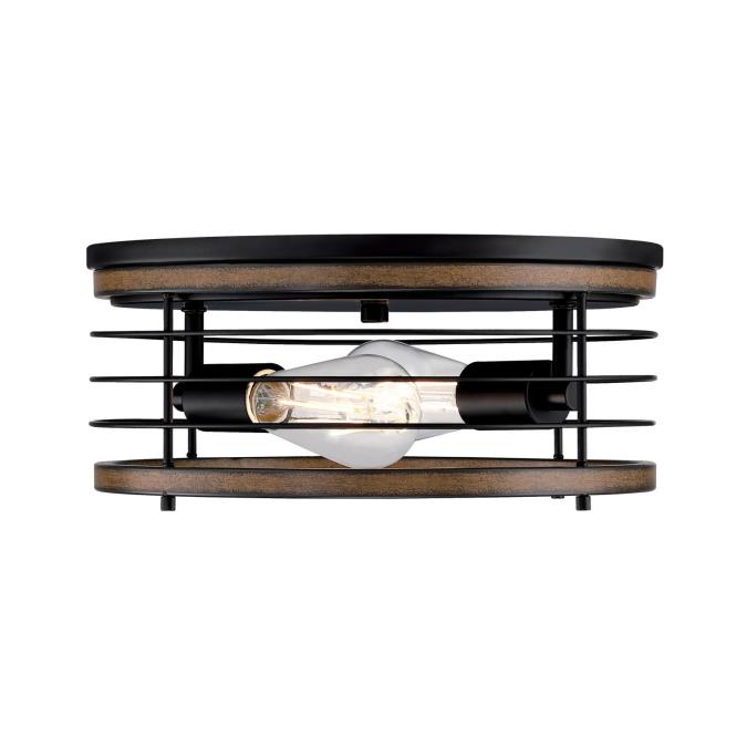 The vintage-style Ackton two-light flush mount in matte black finish with barnwood accents brings a retro vibe to your home. The open cage circular design creates an airy feel, bringing distinctive illumination to hallways, bathrooms, and entryways.