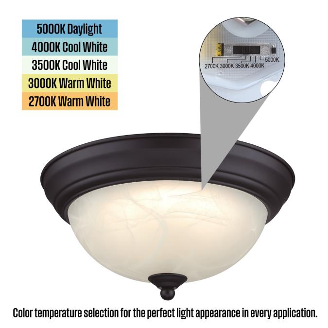 Elevate your home decor with this stunning flush mount light, featuring a black-bronze finish and an elegant white alabaster glass shade. Offering versatile illumination options, you can choose from five color temperatures—warm white (2700K/3000K), cool white (3500K/4000K), and daylight (5000K)—to create the perfect ambiance for any occasion. With integrated LED technology, this energy-efficient fixture ensures long-lasting performance while reducing power consumption. Its dimmable functionality allows for customizable brightness, making it an ideal choice for entryways, hallways, kitchens, and laundry rooms—an exquisite upgrade from standard lighting solutions.