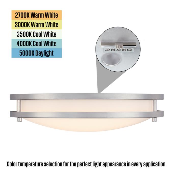 Experience the perfect blend of functionality and style with the 16-inch Lauderdale flush mount ceiling fixture—your ideal lighting solution for every room. This modern fixture features a unique color temperature selection option, allowing you to customize the ambiance of your space to meet your specific needs. During installation, you can easily choose from five distinct color temperature settings: warm white (2700K or 3000K) for a cozy and inviting atmosphere; cool white (3500K or 4000K) for a balanced and neutral setting; or daylight (5000K) for vibrant and energizing illumination.
