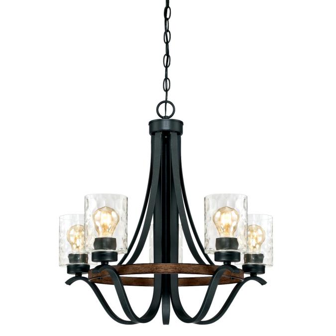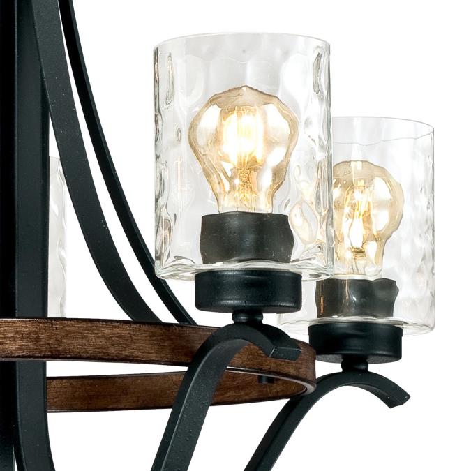 The Barnwell five-light chandelier gets elegance and vintage charm from a creative blend of finishes and textures. The design is strong and fluid, mainly finished in textured iron. A wide, metal band skirts the fixture, featuring a rich, hand-applied, wood-look finish of barnwood. Further enhancing the warmth and raw beauty of the Barnwell are hand-blown clear hammered glass shades.