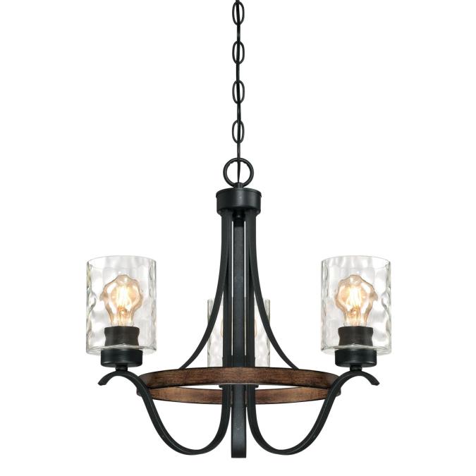 The Barnwell three-light chandelier gets elegance and vintage charm from a unique blend of finishes and textures. The design is strong and fluid, mainly finished in textured iron. A wide, metal band skirts the fixture, featuring a rich, contrasting finish of barnwood, a hand-applied detail with the look of wood. Further enhancing the warmth and raw beauty of the Barnwell are hand blown clear hammered glass shades. Add charm in a small country kitchen or dreamy radiance in a bedroom.