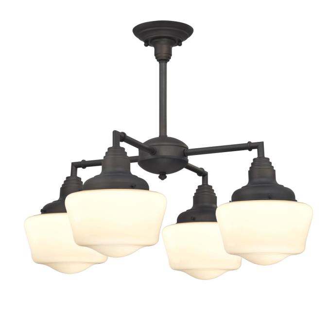 Evoking vintage industrial lighting, Scholar four-light convertible chandelier/semi-flush ceiling fixture adds rustic charm to any decor. Featuring a convertible design, this fixture gives you multiple installation options as a chandelier or a semi-flush. The traditional white opal schoolhouse shades pair nicely with a rich oil rubbed bronze finish to create a vintage American style fixture