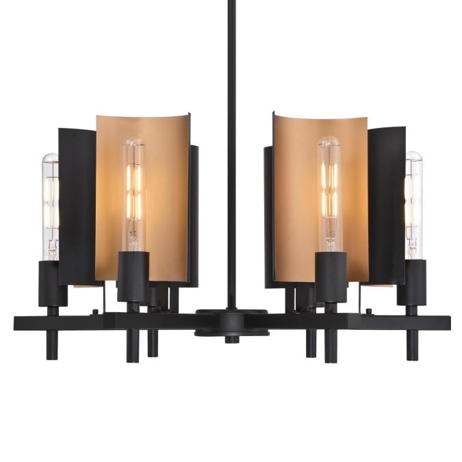 Outward-facing shades reflect a warm radiance with the Sirino six-light chandelier. Featuring a matte black and metallic bronze finish, this chandelier brightens foyers and dining areas with epoch style.