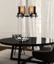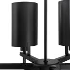 - Matte black chandelier with metallic bronze shades complements wood tones and decorative hardware finishes