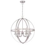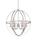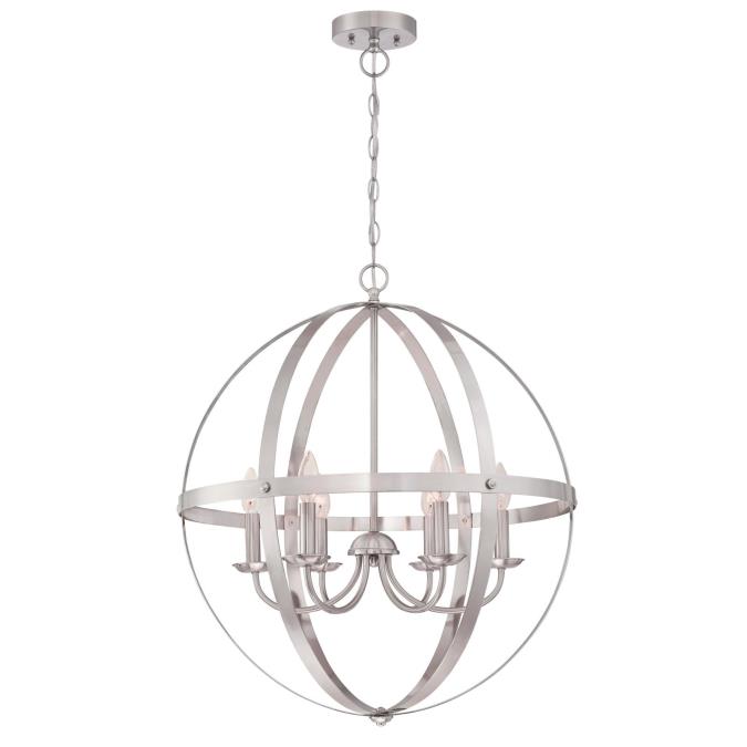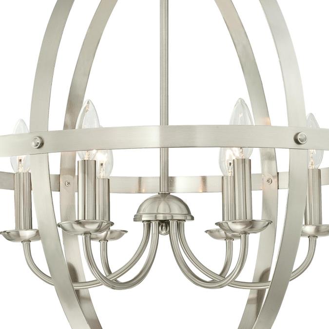 Brushed nickel finish adds a modern touch to this spherical chandelier. Its grand size draws attention to the classic six-light candelabra glowing inside. The beautiful metal orb design creates a feeling of openness, ideal for dining rooms, entryways and open-concept living spaces.