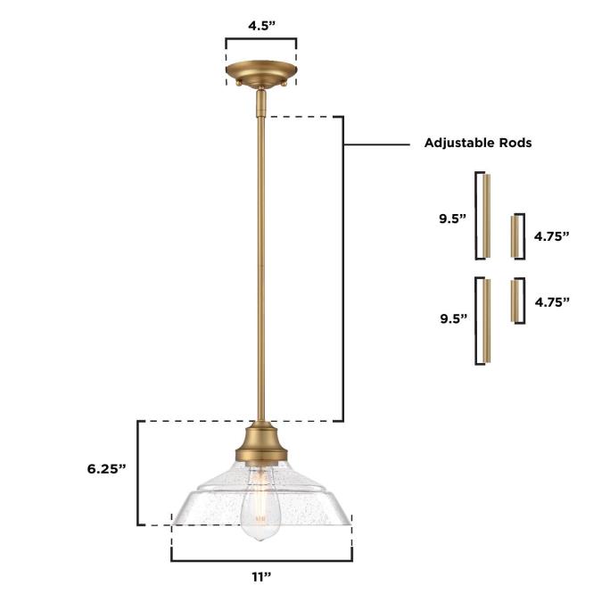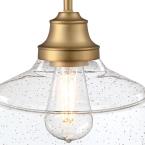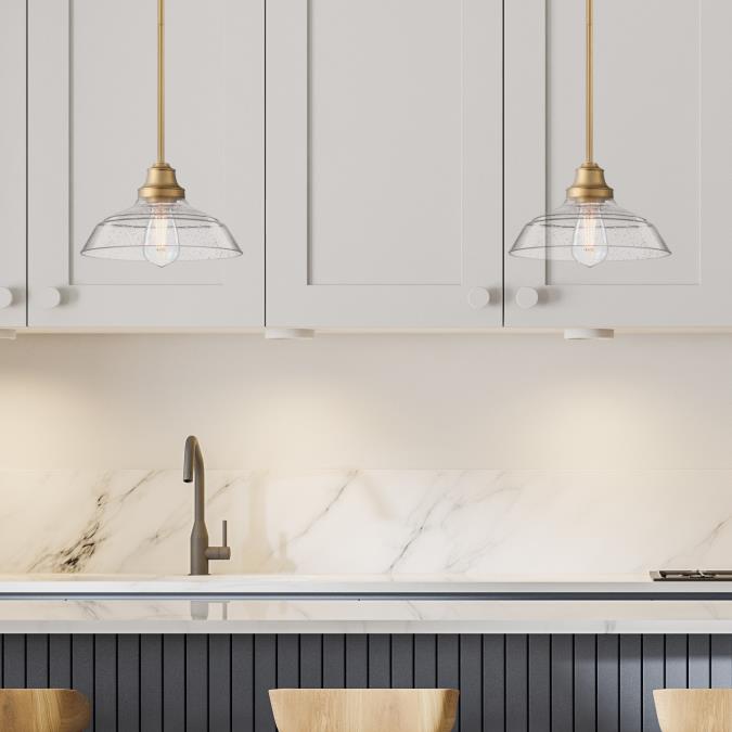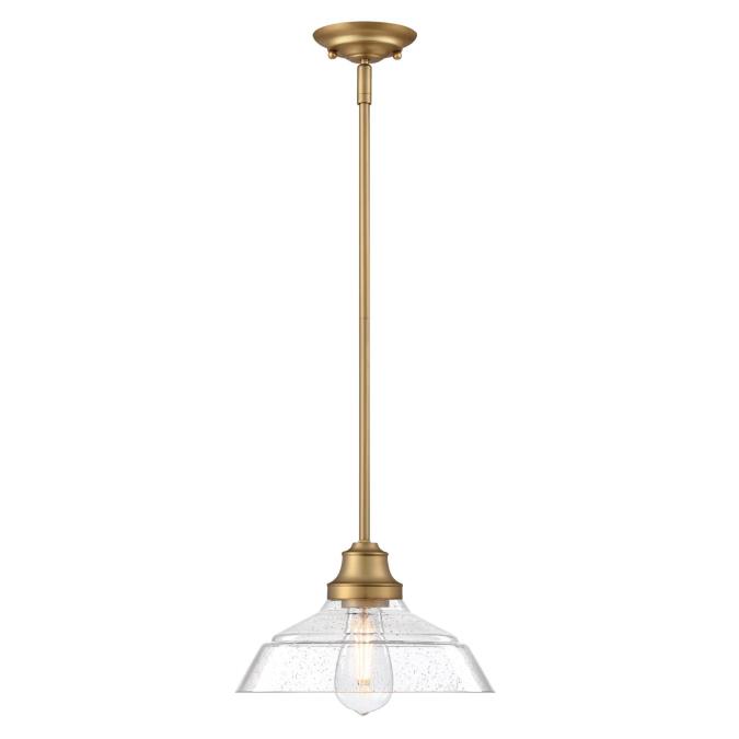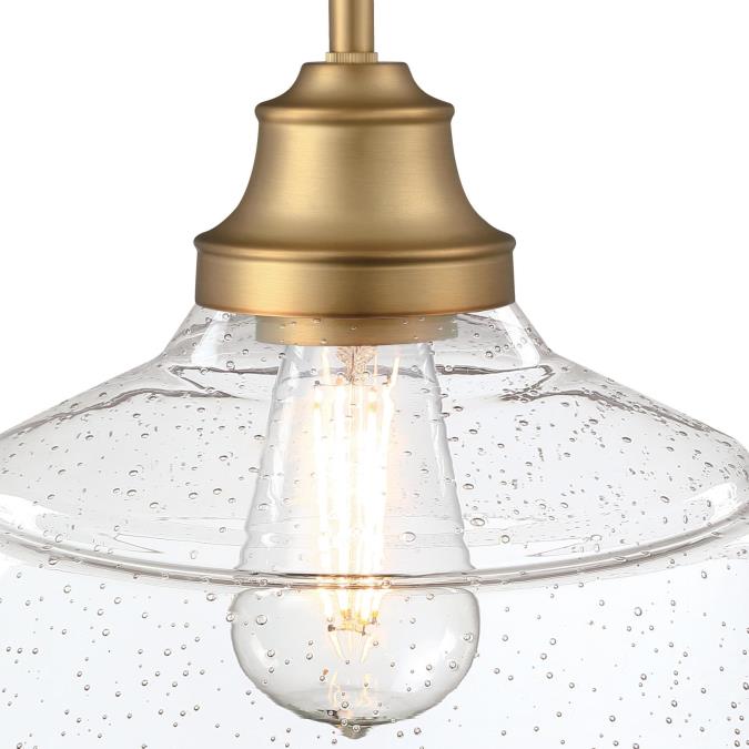 This eye-catching Iron Hill Pendant is the perfect addition to any traditional, modern-farmhouse or industrial room. With a brushed brass finish and a timelessly classic design, this vintage-style pendant will bring a sophisticated look to any space. The seeded glass shade allows plenty of light into the room, creating a warm and inviting atmosphere. Add the Iron Hill Pendant to your home for an elegant touch of style.