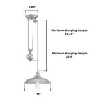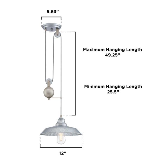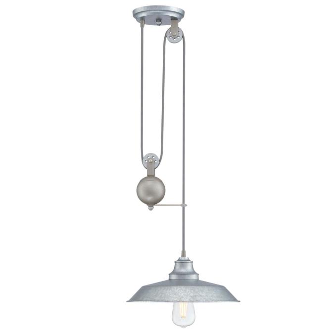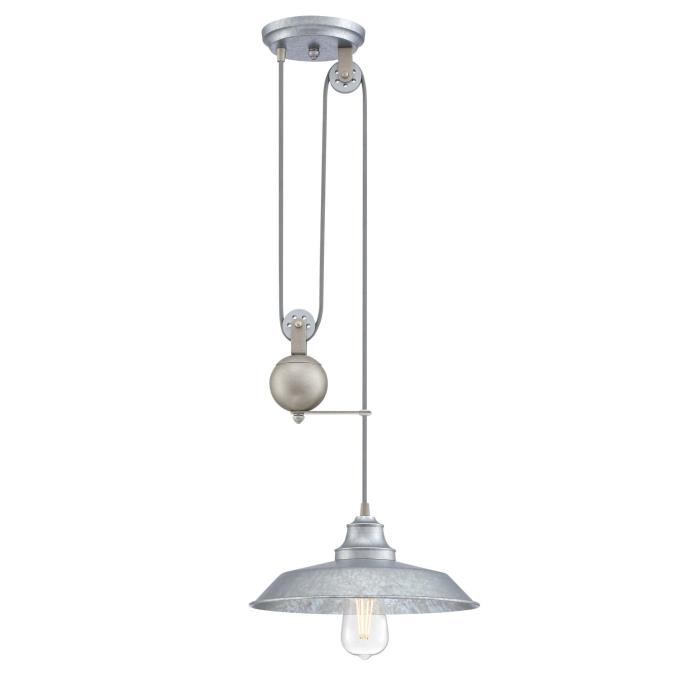 The Iron Hill One-Light Indoor Pulley Pendant adds charm to any setting. The industrial-vintage design of the Iron Hill one-light pulley pendant is perfect for many interior styles. From traditional and transitional living spaces to the popular farmhouse look, the Iron Hill makes an impression. The galvanized steel finish and unique braided cord create industrial appeal.