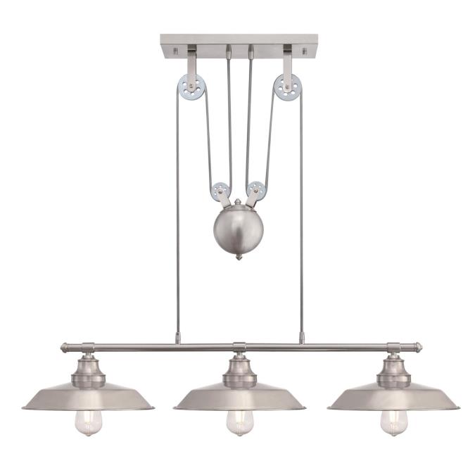 The industrial, vintage design of the Iron Hill pulley pendant is perfect for a multitude of interior styles, from modern living spaces to farmhouse kitchens. Stunning brushed nickel finish on the wide shades, enhanced by a white interior, adds distinctive light and character to any space.