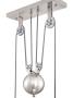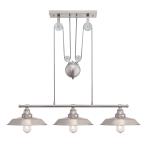 Three-light indoor pendant, adjustable pulley cord, installation instructions and mounting hardware.