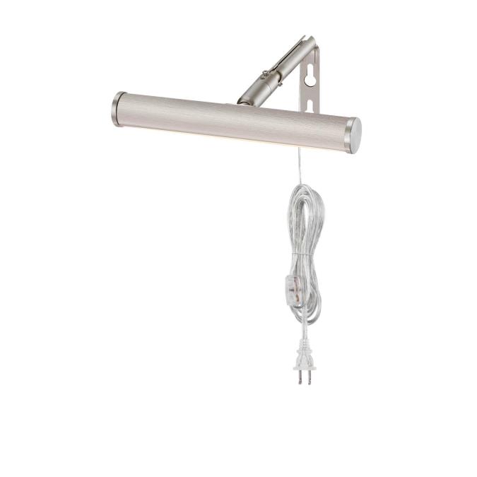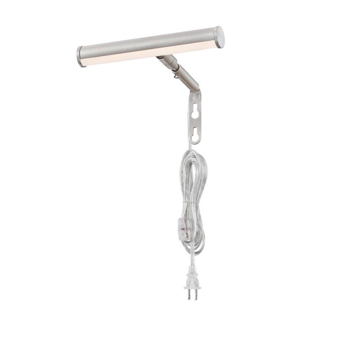 7-inch brushed nickel finish picture light with integrated LED, 8-foot plug-in cord set with in-line on/off switch, mounting hardware, and instructions.