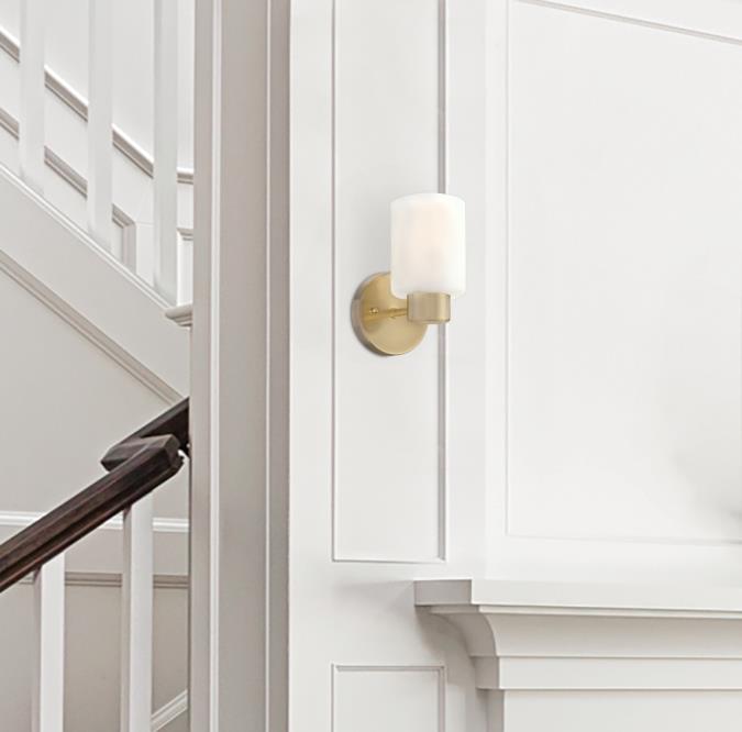 The beautiful champagne brass finish of this Sylvestre wall sconce lends a contemporary flair to this sleek but understated design. The frosted glass shade elevates the casual style and creates a warm glow.