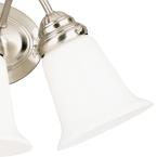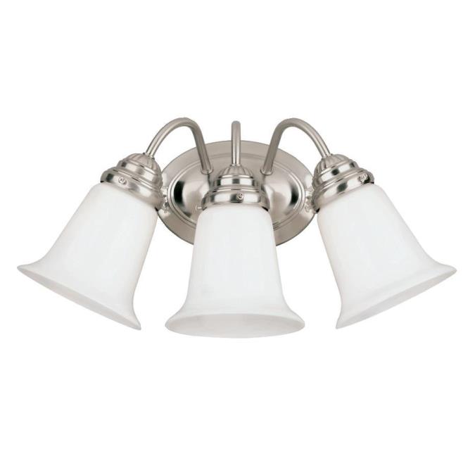This traditional three-light interior wall fixture has a graceful, elegant appearance. Complemented by the bell-shaped white opal glass, the fixture's brushed nickel finish offers a subtle visual draw. Three curved arms attach to an oval back plate to complete the look.