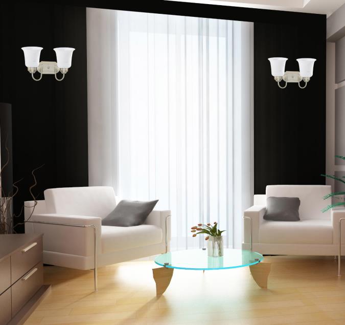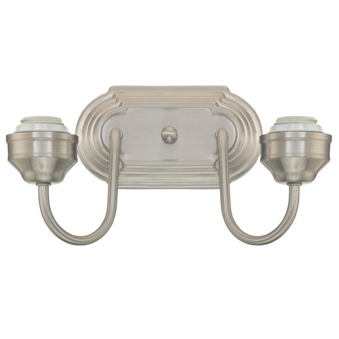 This traditional two-light wall fixture features a brushed nickel finish, sculpted shade rings, sinuous arms, and a back plate with decorative ribbed edge. The design works especially well in a bathroom, bedroom, or den, but however you use it, you will enjoy the fixture's versatile style.