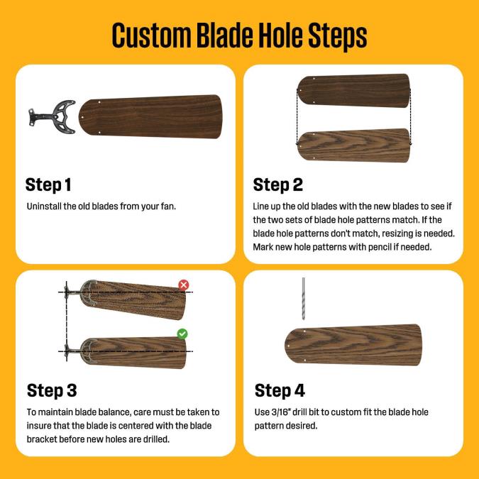 Reversible blades feature two complementary finishes, oak and walnut, to renew your fan's appearance. The pre-drilled holes are compatible with Westinghouse replacement fan blade arms, and fit most 52-inch ceiling fans. Easy to follow drilling instructions are included for a custom fit, when pre-drilled holes don’t align.