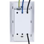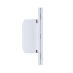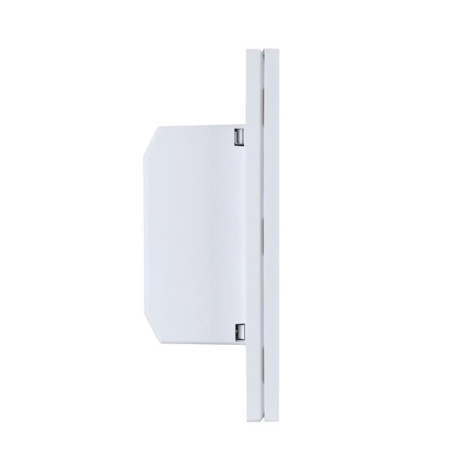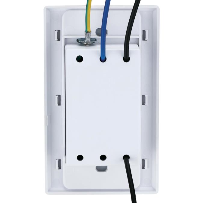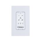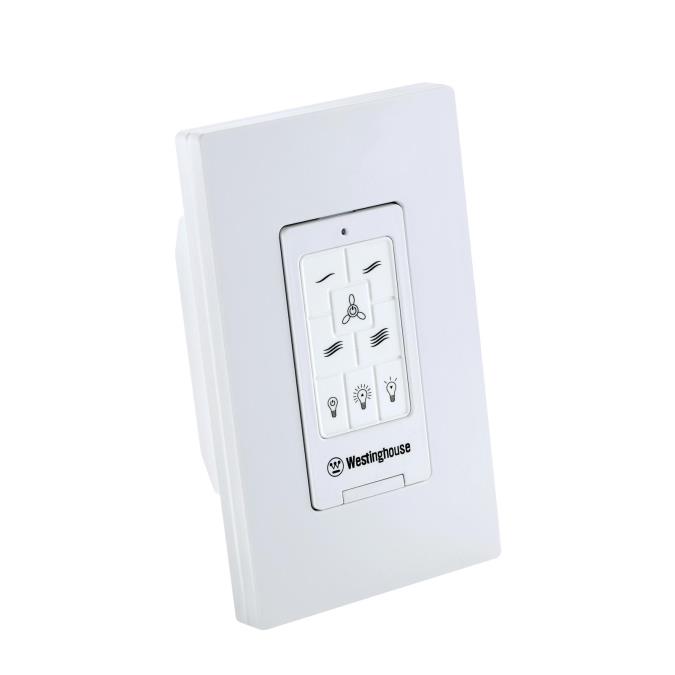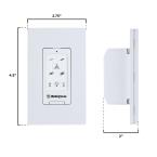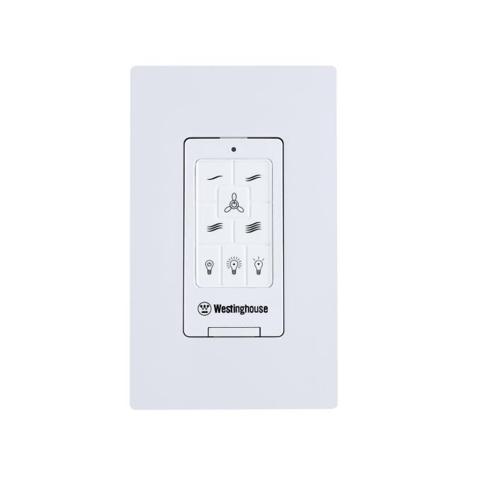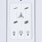 The modern control unit recesses into the wall creating a low profile with a sleek white cover for a flat-surfaced appearance. Subtle graphics depict fan speed and light control buttons, making it easy to create the perfect atmosphere.