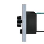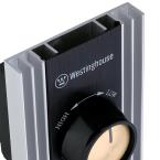 It features two-wire installation and installs in standard wall junction boxes. The modern control unit recesses into the wall creating a low profile with a sleek black and nickel corrugated design.