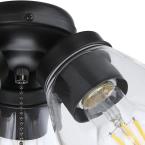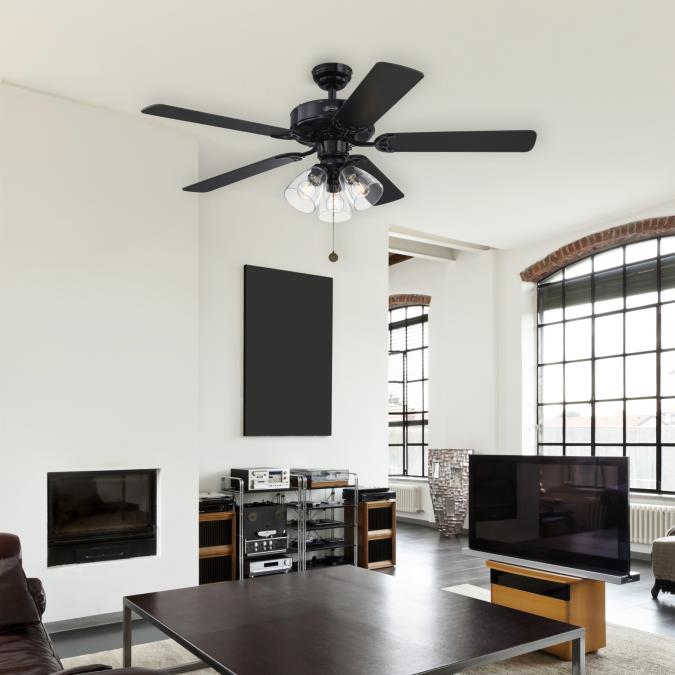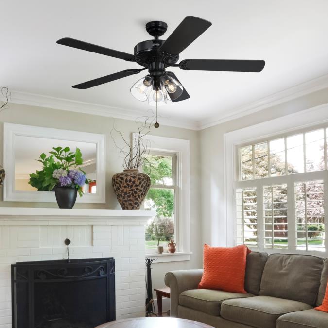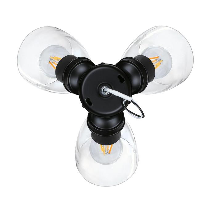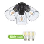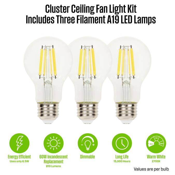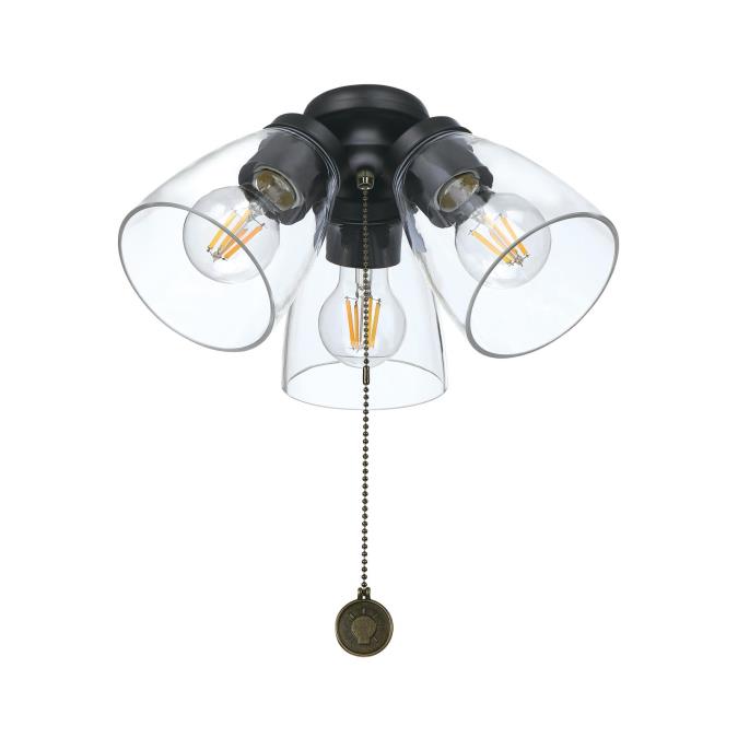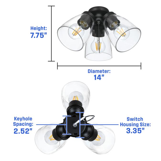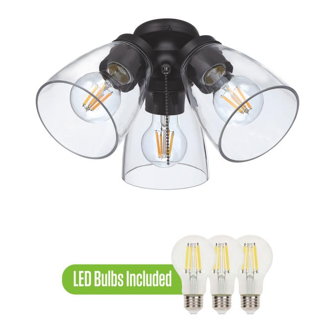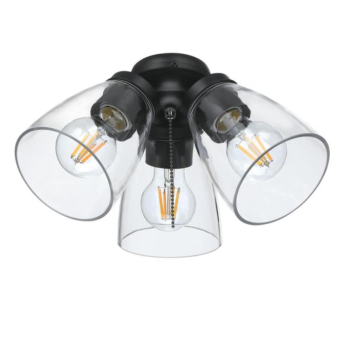 APPLICATIONS: Ideal for indoor ceiling fans, excellent for adding or replacing light fixtures.CLASSIC STYLE: Elegant 3-light design featuring a matte black finish and clear glass shades.LIGHTING SOURCE: Omni A19 bulb that emits a warm white light at 2700K.SIMPLE INSTALLATION: Compatible with most standard 42–52 inch ceiling fans with a central hole in the housing cap.ASSEMBLED DIMENSIONS: 14″ diameter x 7.75″ height.